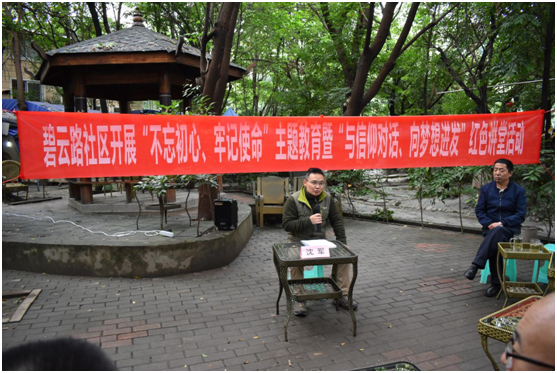 四川新闻网成都10月30日讯 成都双楠街道碧云路社区持续深入开展“不忘初心、牢记使命”主题教育活动。10月25日,社区举行“不忘初心、牢记使命”主题教育暨“与信仰对话.向梦想进发”红色讲堂活动。活动邀请到老党员沈军同志与社区党员群众面对面交流,解读“不忘初心、牢记使命”的深层含义。