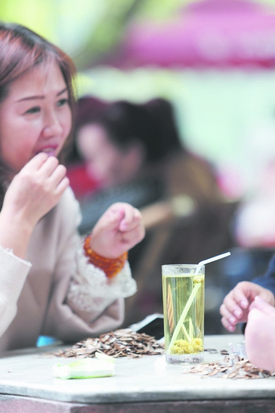 在展区赏菊拍照,累了,就和家人坐在鹤鸣茶舍竹椅上,泡一杯菊花茶,看着往来的游客,欣赏刚拍的图片,成都人的惬意生活就因为秋天的这朵花,让幸福慢慢氤氲,直到四季!本报记者 王若冰 张青青 摄